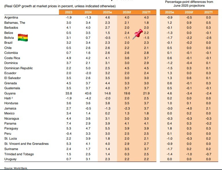 El BM ratifica que BOLIVIA está en recesión, según sus datos el 2025 se estima que nuestra economía decreció en 0,5%. Sus proyecciones para el 2026 y 2027 indican que la tendencia continua, con un -1,1% y -1,5% respectivamente. De acuerdo a este organismo, seremos el 2do país en recesión para este 2026, después de Jamaica (-2,3%).