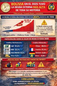 Es decir, la actual deuda pública de Bolivia, entre interna y externa, está bordeando el 90% del PIB. Con el CAF y el BID se sumarán 7.600 millones de dólares a partir de este año 2026, y la deuda interna seguirá creciendo, ya que no se evidencia a corto plazo reajustes drásticos en el gasto estatal (masa salarial, empresas públicas, otros), lo cual impulsará a que el BCB continúe financiando el déficit fiscal y opere como una especie de «caja chica» para el sector público, sobre todo si la misma no refleja autonomía ni independencia al ejecutivo.
