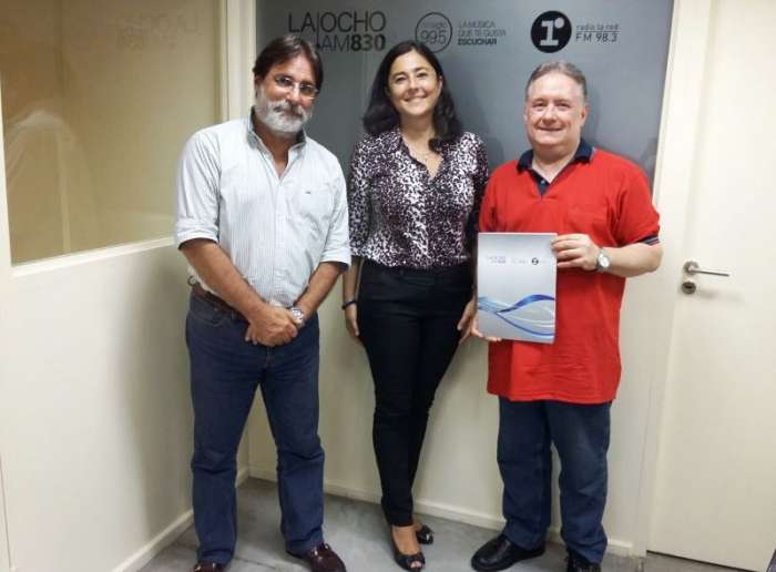 En la foto Jorge Ferrari y Rubén Alejandro Fraga, después de firmar el correspondiente contrato, posan junta Valeria Pereyra, Gerente Comercial de la emisora rosarina. (Jackemate.com)