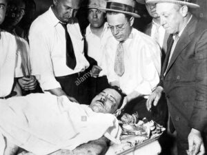 Tras el intensísimo, aunque breve tiroteo, John Herbert Dillinger quedó tirado en el suelo, mirando sin ver el cielo con un ojo destruido por un impacto de bala, muerto con su cuerpo mitad en la acera y el resto del cuerpo, exánime, en la calzada que pretendía cruzar corriendo.