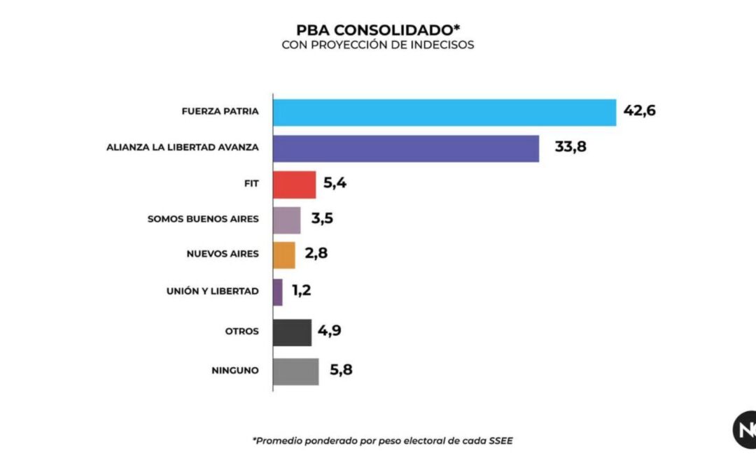 Mientras la casi totalidad de las empresas del rubro auguraban una elección mucho más reñida, e incluso varias le daban una amplia ventaja a ‘La Libertad Avanza’, ‘Nueva Comunicación’ en su último trabajo finalizado el 29 de agosto y publicado el 2 de setiembre, le otorgaba 42,6 puntos porcentuales a ‘Fuerza Patria’ contra 33,8 % a ‘La Libertad Avanza’.