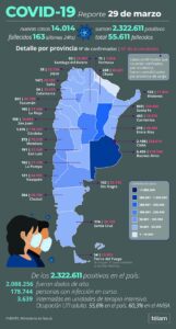 Frente a este panorama nada alentador para los argentinos, se conoció que en las últimas 24 horas murieron otras 163 personas y 14.014 fueron reportadas con Coronavirus, con lo que suman 55.611 los fallecidos y 2.322.611 los contagiados desde el inicio de la Pandemia, informó el Ministerio de Salud.