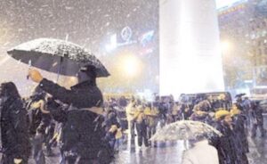 El Obelisco rodeado de cientos de personas disfrutando de la inusual nevada